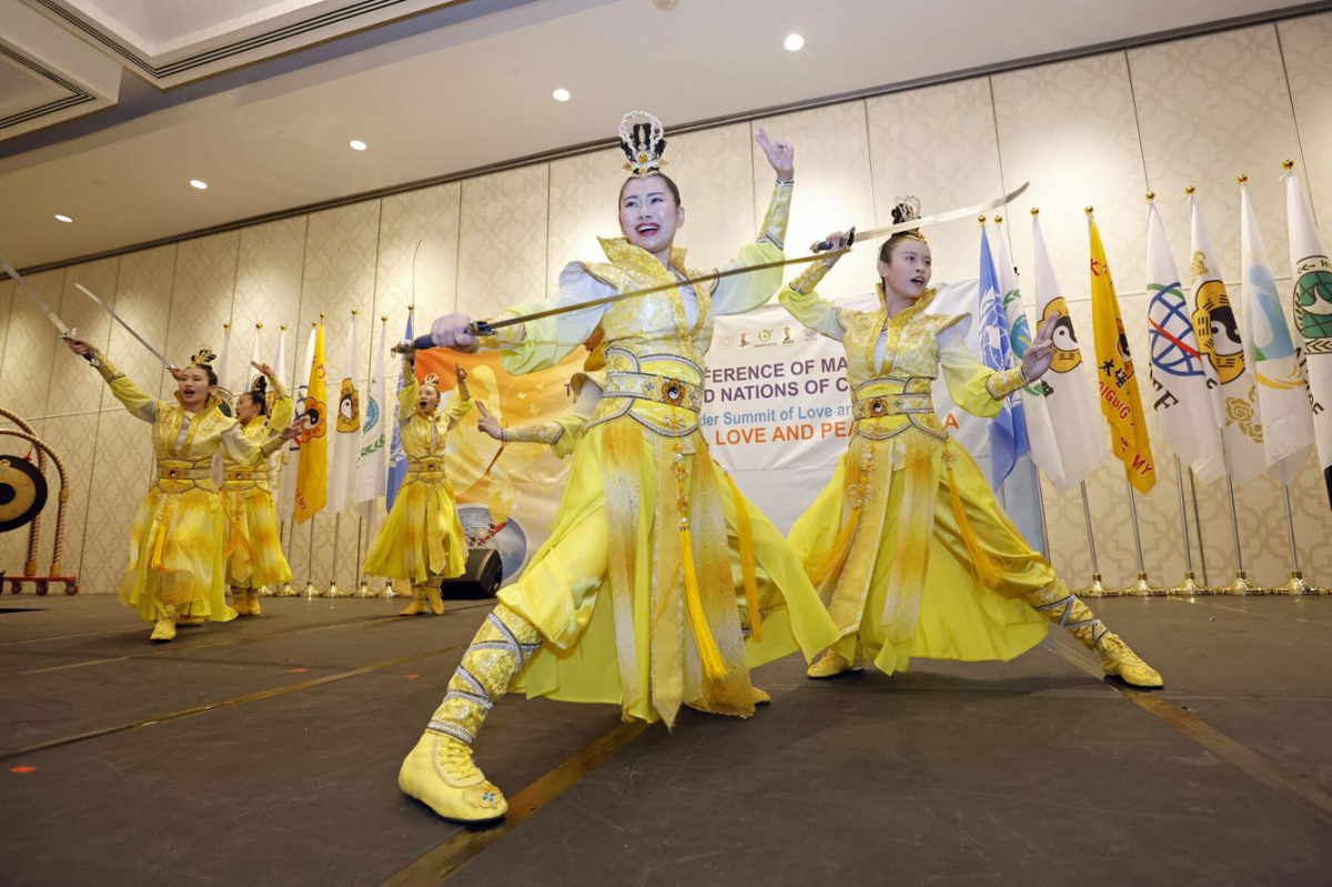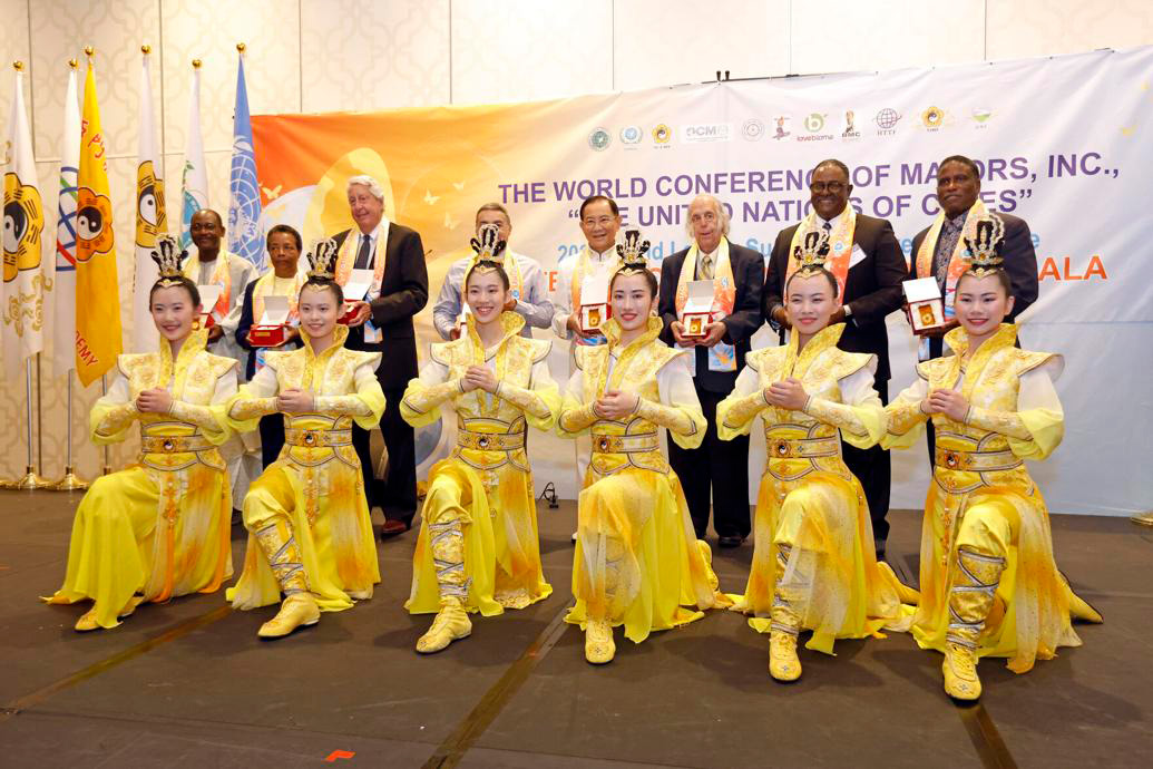 IMAGE DISTRIBUTED FOR FEDERATION OF WORLD PEACE AND LOVE - Dr. Hong, Tao-Tze, president of the Federation of World Peace and Love (FOWPAL), right, is presented with the "Love and Peace Award" by Johnny Ford, founder and president of the World Conference o