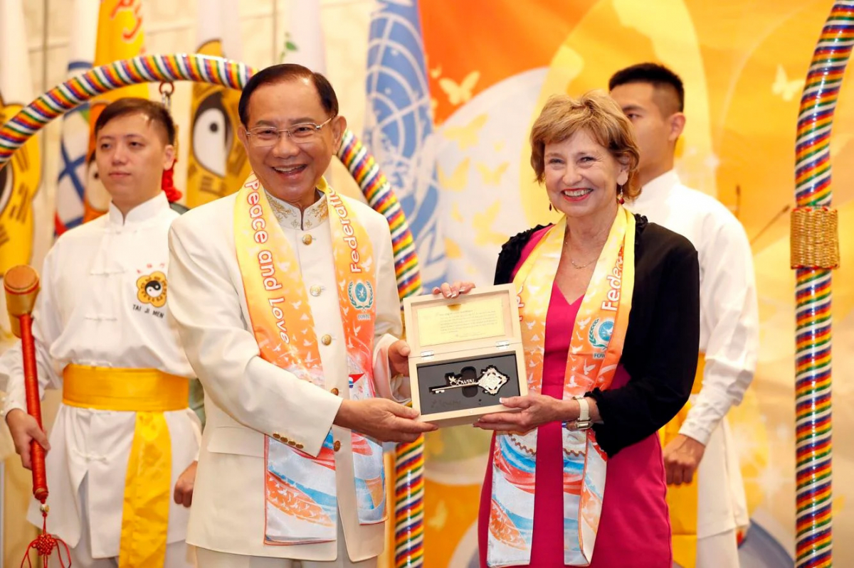 Dr. Ricki Garrett, Interim President of Sister Cities International, right, is presented with the "Key to the Heart" by Dr. Hong, Tao-Tze, president of the Federation of World Peace and Love (FOWPAL), after ringing the Bell of World Peace and Love during the World Conference of Mayors in New Orleans on August 4, 2023. The key symbolizes that conscience is the key to a successful life.